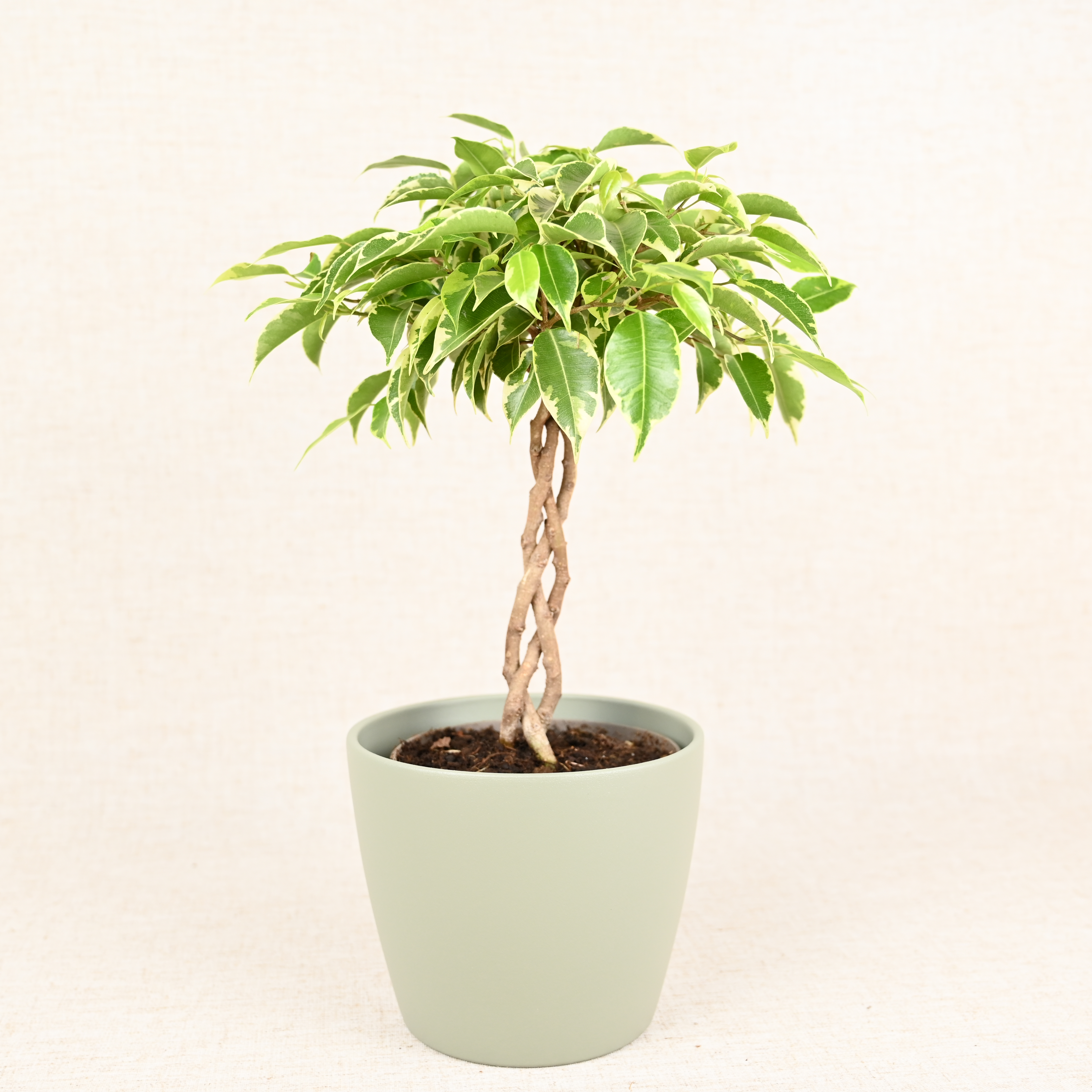 This captivating Braided Ficus Benjamina is a stunning addition to any indoor space. Its intricately braided trunk adds a unique touch to its elegant, cascading foliage. With its glossy green leaves, this plant effortlessly brings a touch of nature indoors.