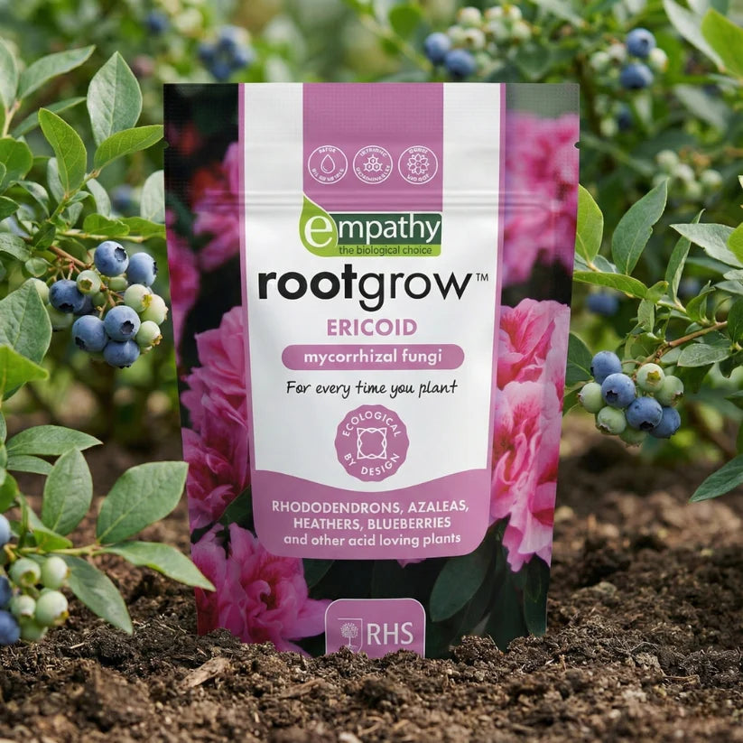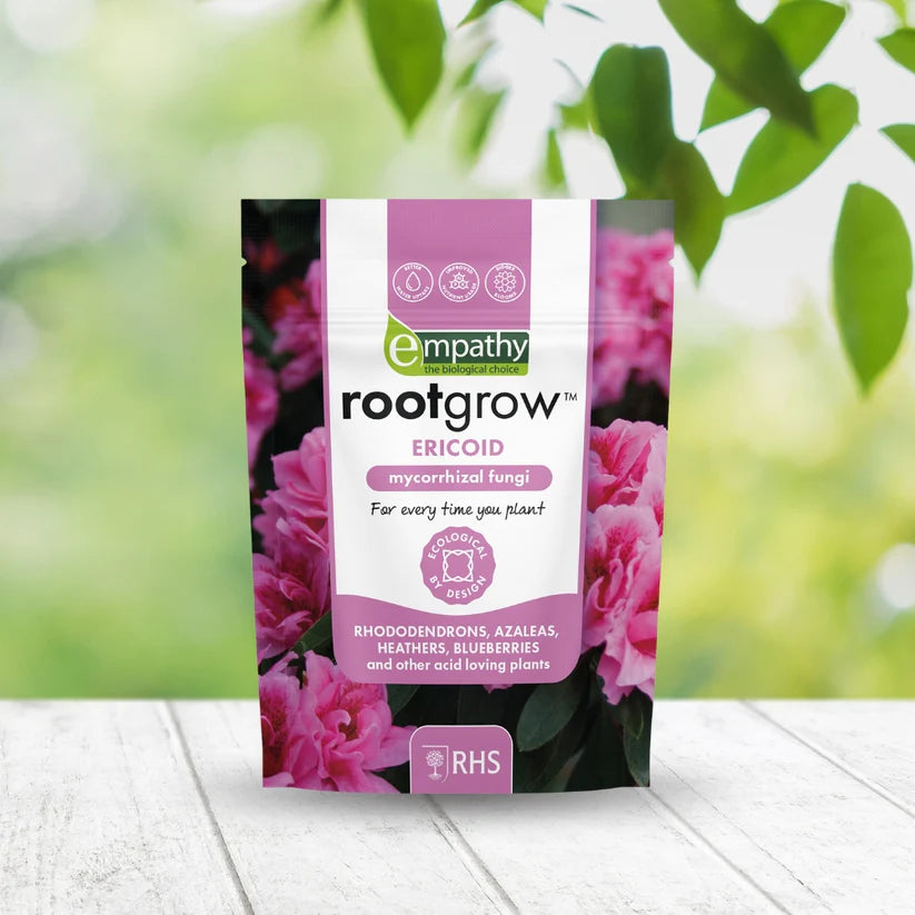 Empathy rootgrow Ericoid 200g contains natural ericoid and arbuscular mycorrhizal fungi that help acid loving plants develop stronger more efficient root systems for life. This RHS endorsed treatment is designed for rhododendrons azaleas heathers blueberries and other ericaceous plants that need support in low pH soils. Applied once at planting it gives long term benefits by improving nutrient and water uptake and helping plants establish more reliably. The pack includes a 10ml scoop for easy measuring.