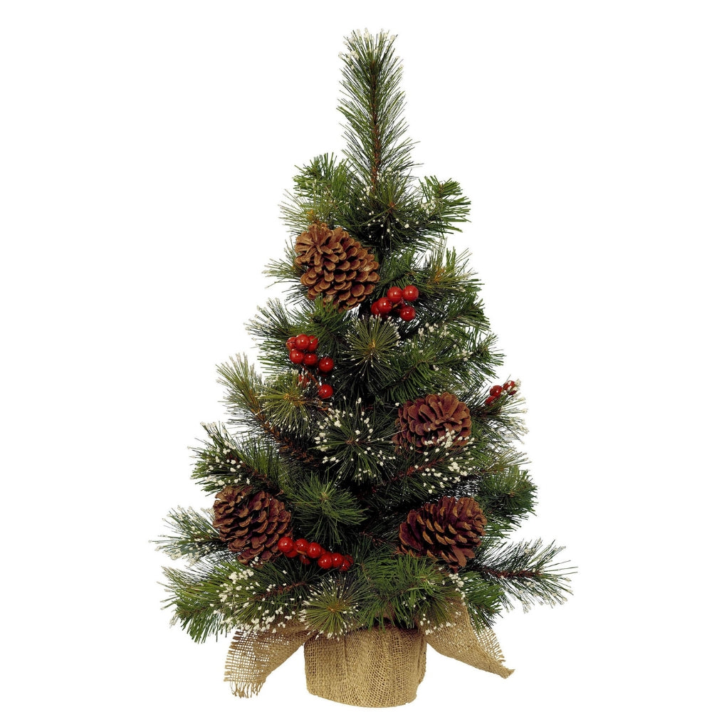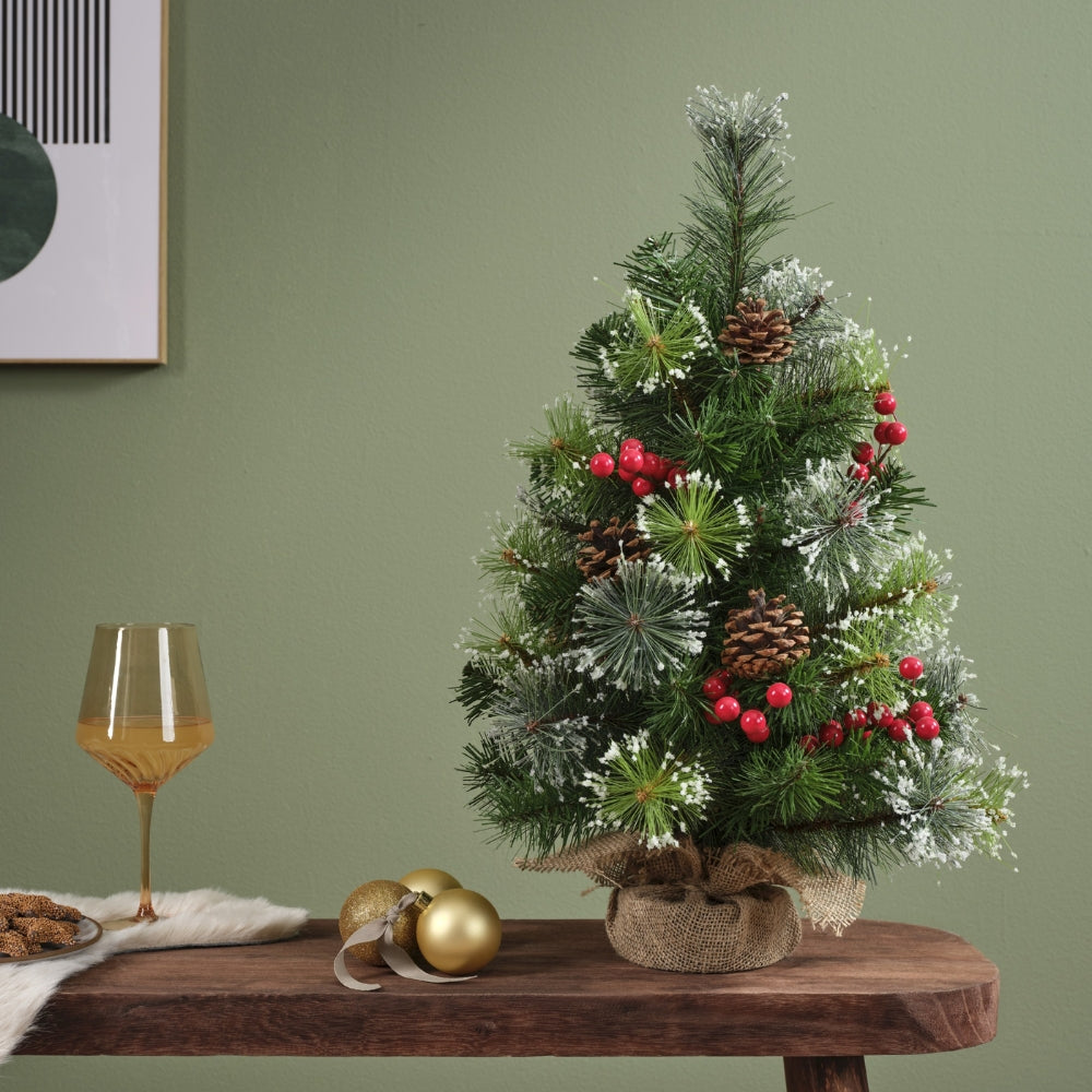 This compact Everlands Mini Ipswich Christmas Tree brings gentle wintry colour to smaller spaces with soft snowy tips bright berries and natural pinecones. It arrives ready shaped with only a light fluff needed and is set in a rustic jute bag that gives it a warm handmade feel. The design works well on side tables shelves and hallways and comes in three heights so you can choose the right size for your home.
