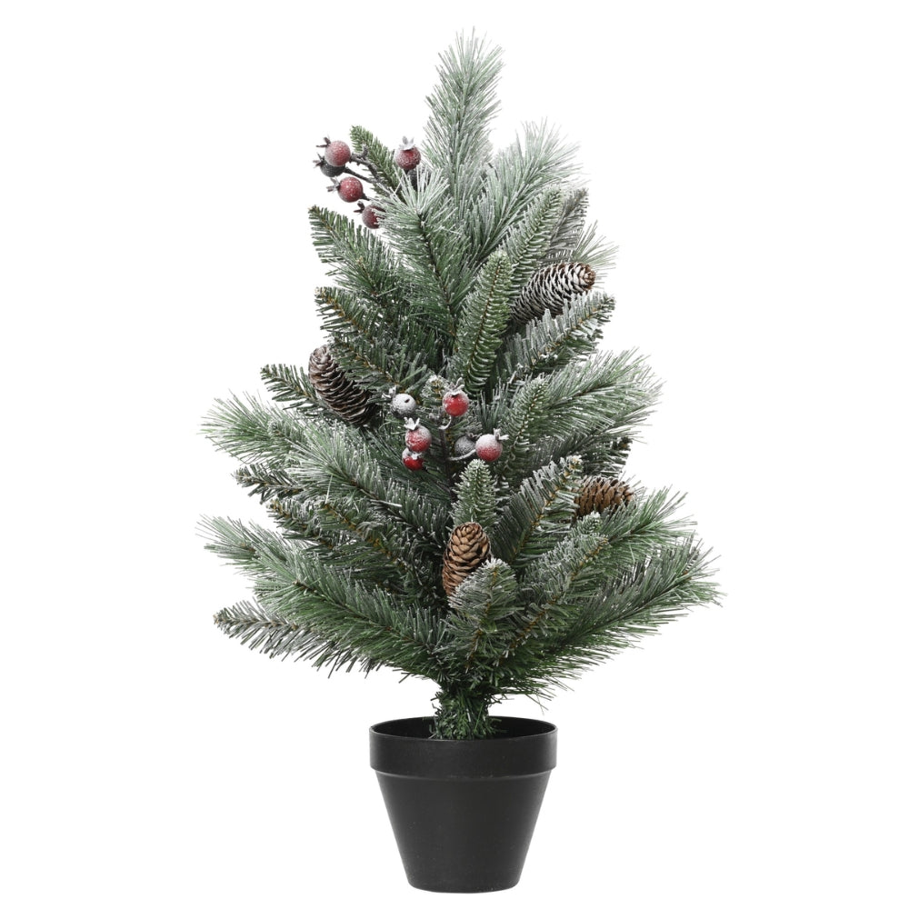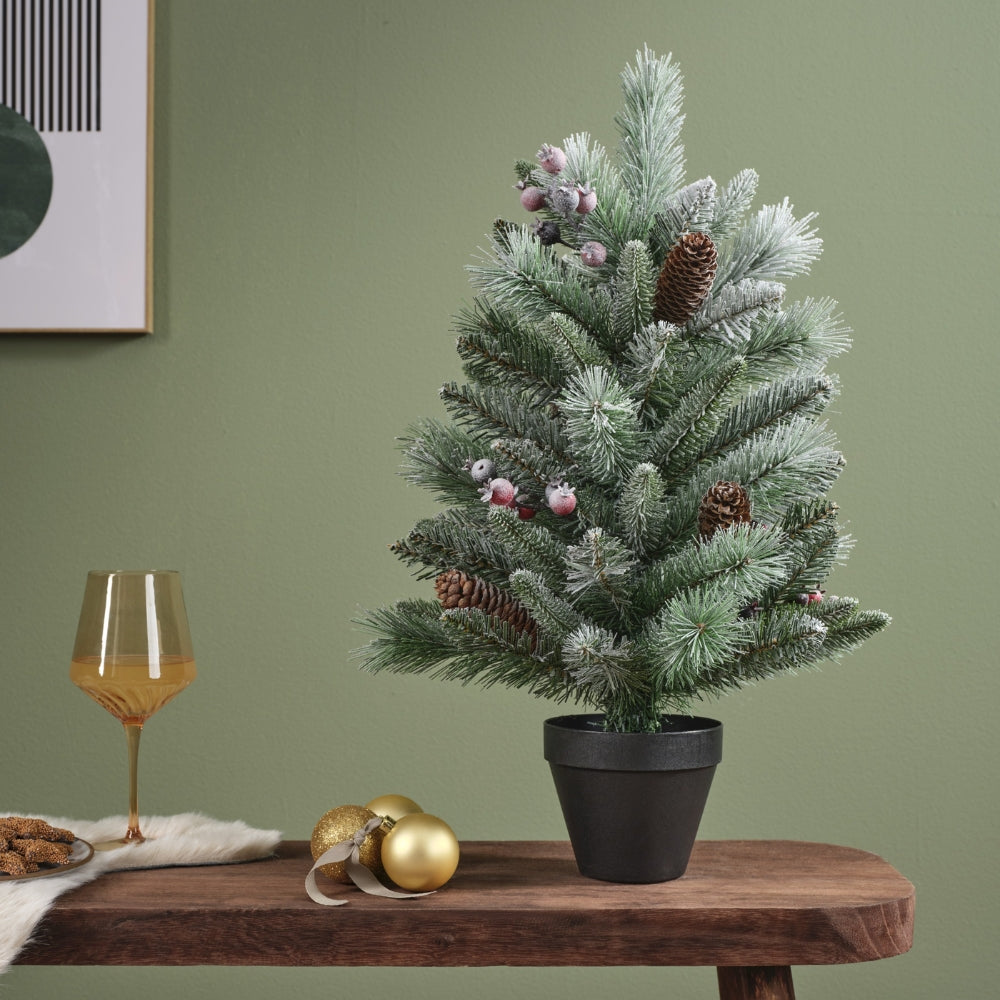 The Everlands Mini Frosted Windham Tree brings a classic winter look to smaller spaces with its mix of PE and PVC tips soft snowy finish and bright touches of berries and pinecones. Each size sits in a simple black pot that can be placed inside a more decorative container if you prefer. A light fluff on arrival creates a fuller shape and the tree works well on tables shelves and corners where you want a calm festive focal point without needing extra decorating.